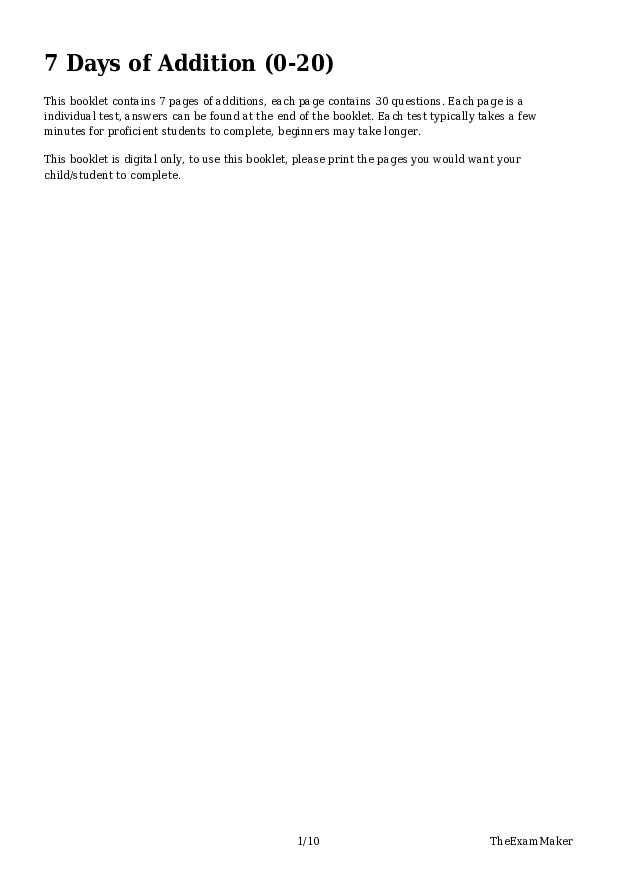 This booklet contains 7 pages of additions, each page contains 30 questions. Each page is a individual test, answers can be found at the end of the booklet. Each test typically takes a few minutes for proficient students to complete, beginners may take longer. This booklet is digital only, to use this booklet, please print the pages you would want your child/student to complete.